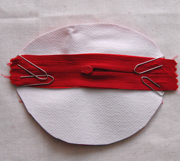 sur le bord 1 (on regarde sur les gabarits, et oui, y’a des repères) de la pièce A, épinglez la fermeture Éclair à l’envers (pourquoi à l’envers ??? faites vous verrez bien !!!)