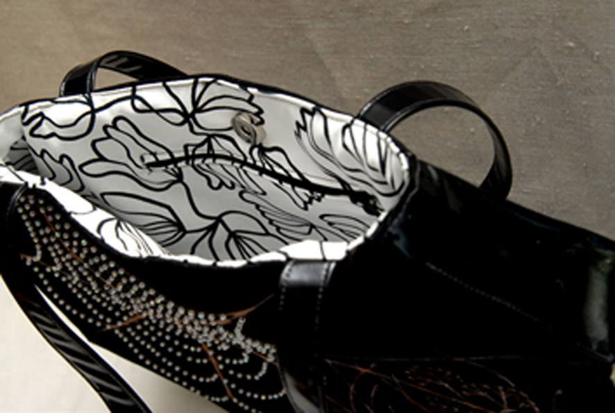 Sur une toile de lin noire, j’ai eu envie de travailler ce sac comme un tableau.