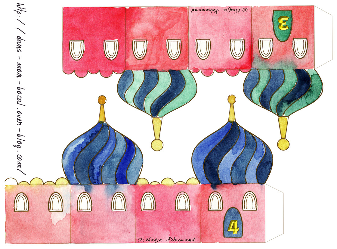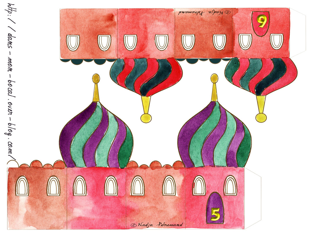 Et hop ! Encore une petite série de maisonnettes à imprimer sur du papier 240 g et à découper pour son calendrier de l’avent village russe.