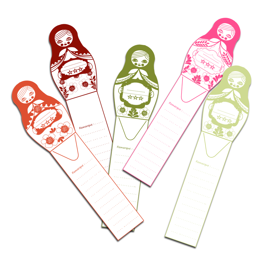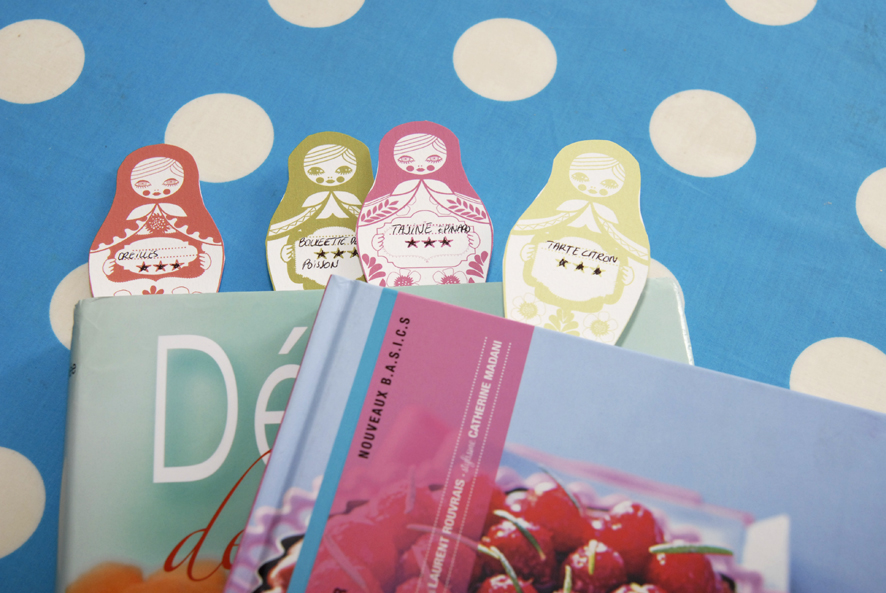 Avec ces marques pages poupées russe, tout est réuni ! Il ne bouge plus grâce à leur petit cran, je peux d’un seul coup d’œil savoir de quelle recette il s’agit, et je peux noter les modifications que j’apporte à la recette.