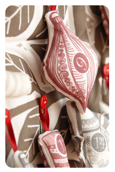 Dessiné l’an passé, je ne vous le montre qu’aujourd’hui, je n’avais pas eu le temps l’année dernière de le coudre à temps. J’avais imaginé un coupon avec le sapin et les petites déco à accrocher jour après jours.