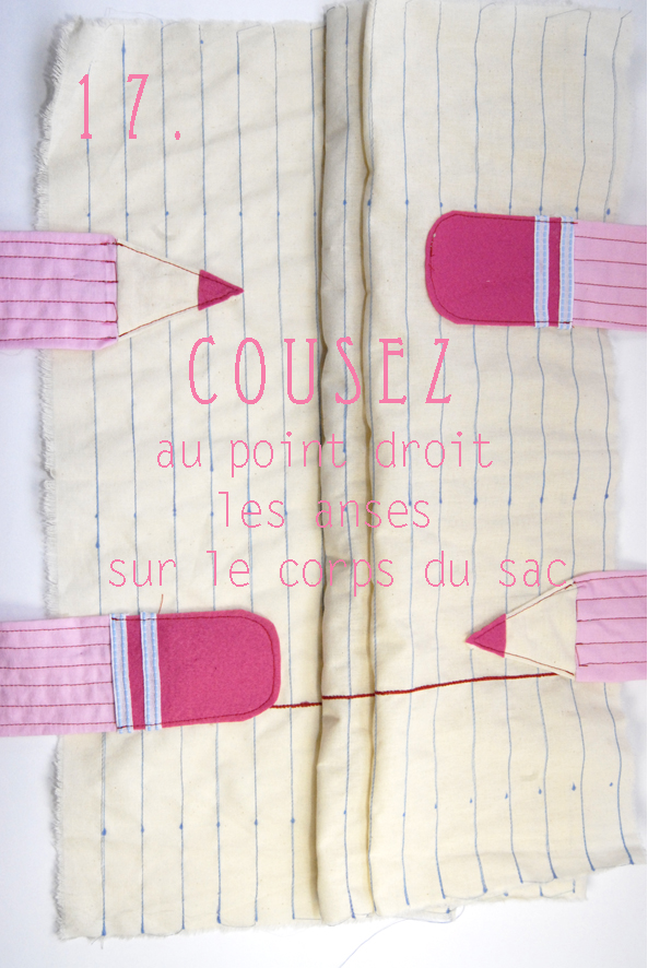 Découpez le corps du sac et les pointes du crayon dans le tissu écru, les anses dans le tissu de couleur (vous pouvez varier les mesures si vous voulez des anses plus ou moins longue et plus ou moins large à vous de voir !)